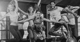 Composition of group of athletic people jumping and smiling over light blur