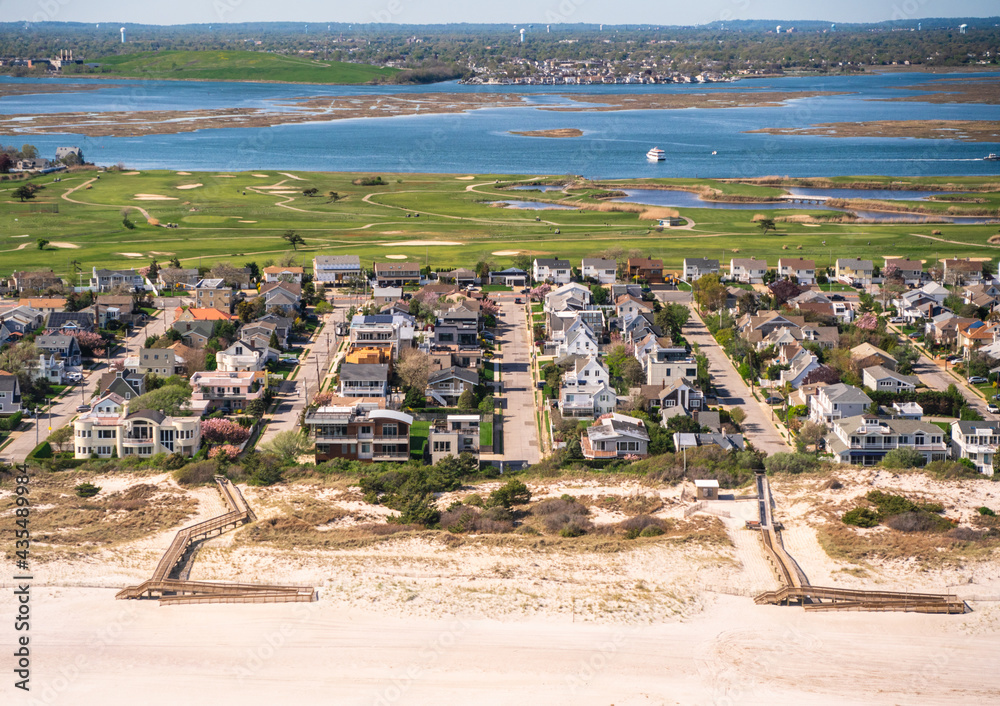 Aerial view over Nassau County on Long Island New York with community of homes in view