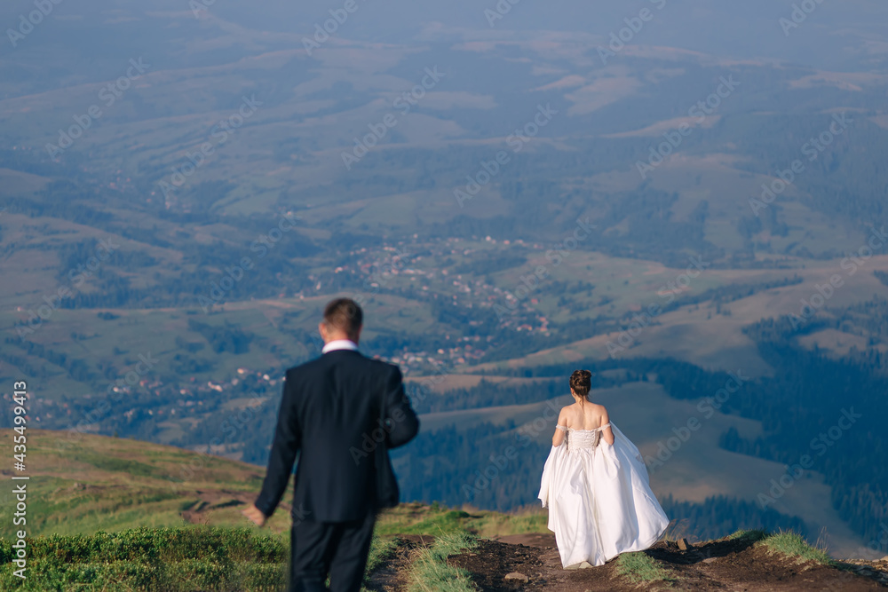 The bride and groom are walking along the path of the spring field. Newlyweds run along a country road on their honeymoon. Back view.