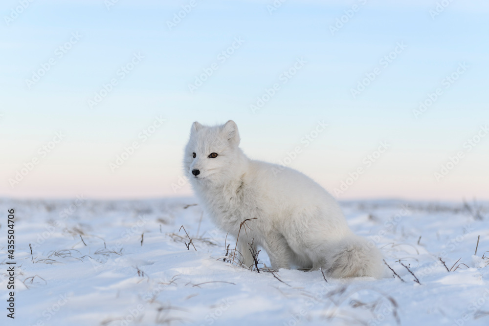 Arctic fox (Vulpes Lagopus) in wilde tundra. White arctic fox sitting.