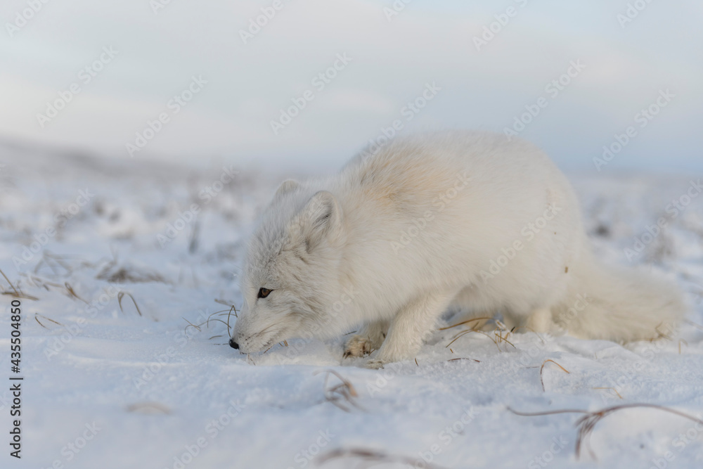 Arctic fox (Vulpes Lagopus) in winter time in Siberian tundra with industrial background.