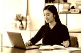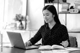 Cute smart confident asian girl, freelancer or student sitting at work desk, using laptop for work or study, taking notes during online webinar or distance learning, looking at screen, smiling