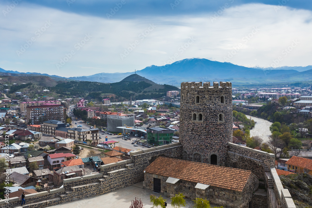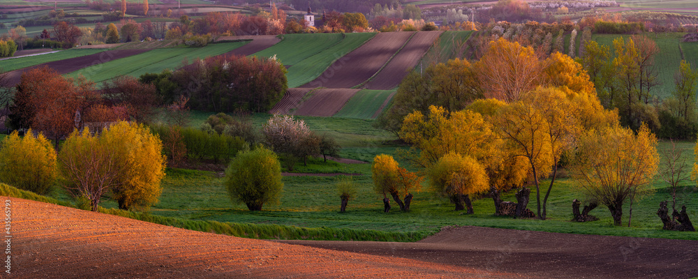 spring panorama of fields on farmland cultivated extensively and ecologically