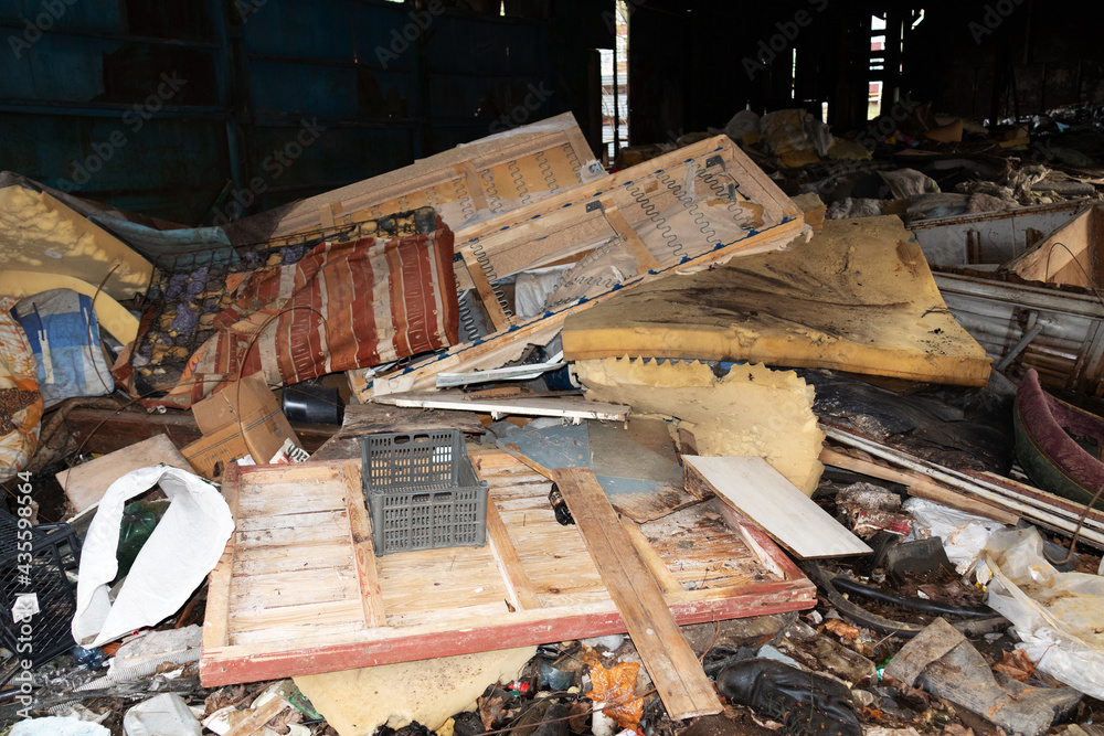 Pile of wooden rubbish, broken dirty furniture in the barn.