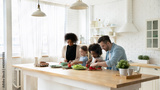 Young multiethnic family with small diverse teen daughters prepare healthy tasty food in kitchen together. Multiracial mom and dad cook at home with little girls children. Adoption, custody concept.