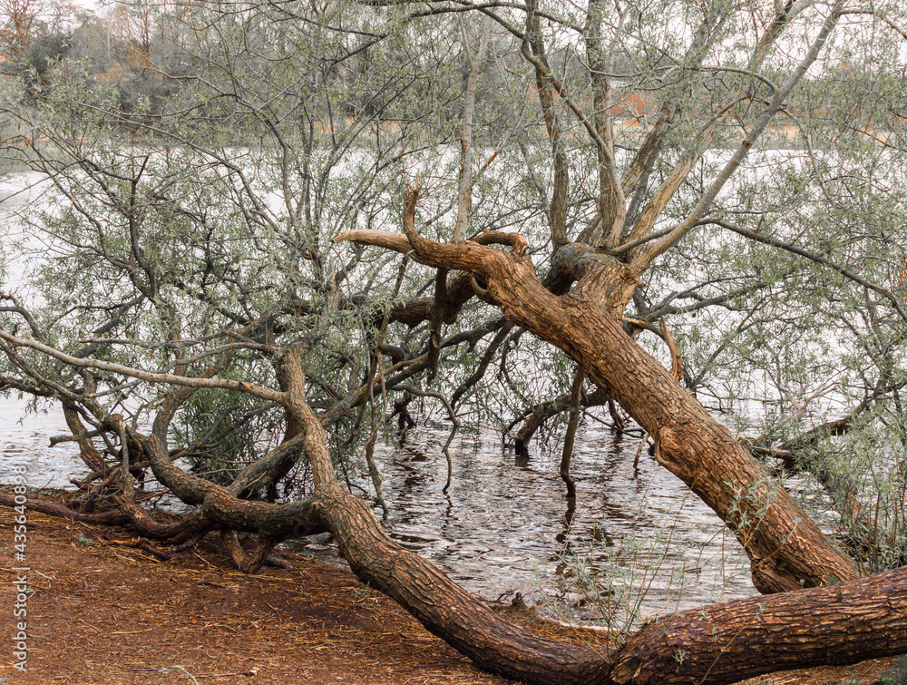 Fallen down tree still growing on the edge of Pickmere Lake, Pickmere, Knutsford, Cheshire, UK