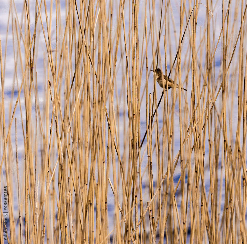 Sedge Warbler on reeds at Pickmere Lake, Pickmere, Knutsford, Cheshire, UK
