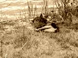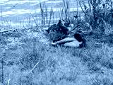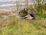 Mallard family resting on edge of Pickmere Lake, Knutsford, Cheshire, Uk