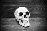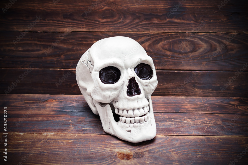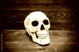 Human skull on wooden plank surface.