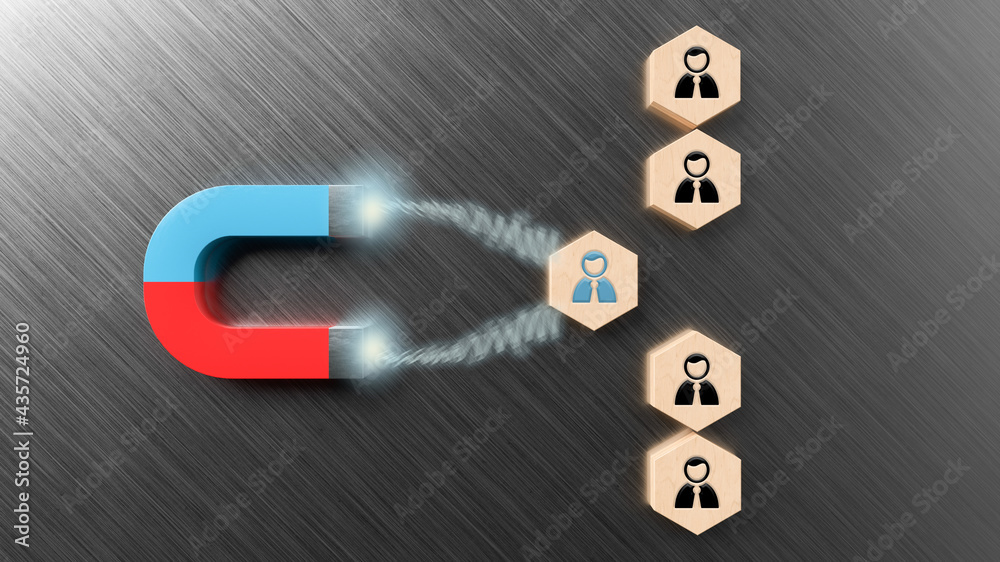 magnet attracting a hexagon with a person symbol on it on brushed aluminum background