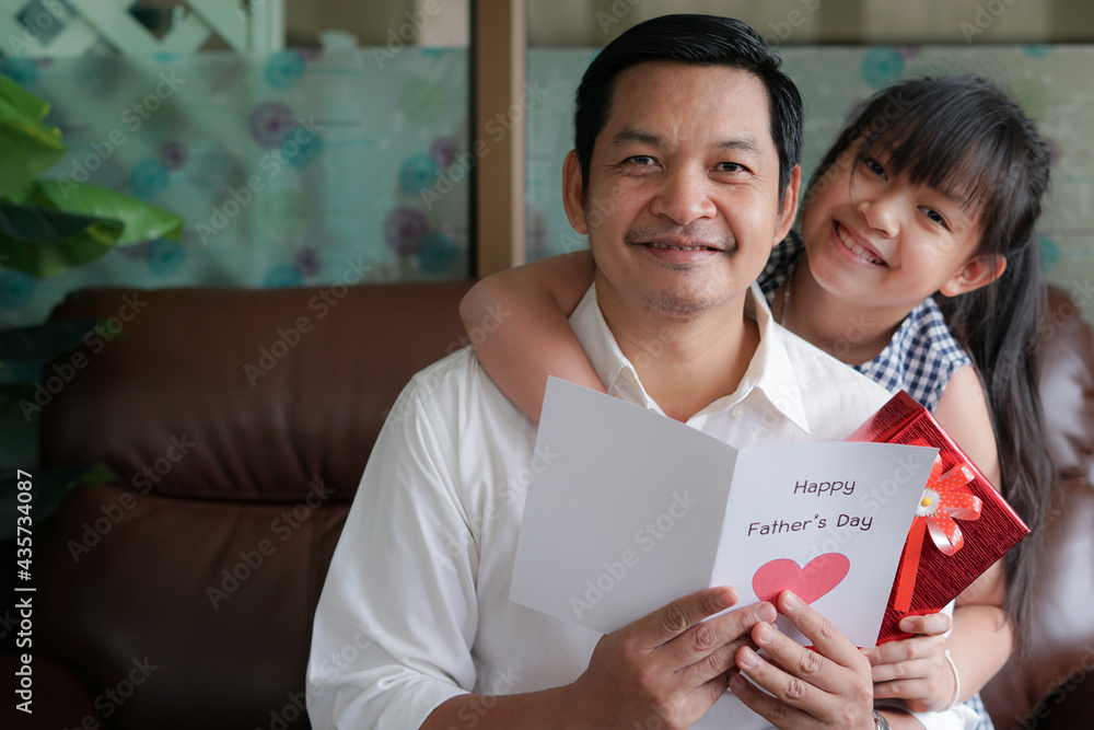 Asian little child daughters congratulating dad and giving him postcard and gift box with smiling and hugging.Concept of Happy father's day