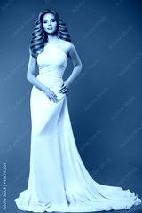 Beauty Model with Curly Hair Style in White Bridal Dress. Bride Fashion Woman in Wedding Gown Full Length. Luxury Makeup and Perfect Hairstyle over Gray Background
