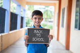 Smiling Young kid looking camera and showing by back to school sign board school at corridor - concept of school reopen and back to school.