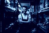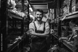 Young smiling happy tattooed bearded worker in overalls standing in storage of import and export firm with arms crossed.