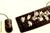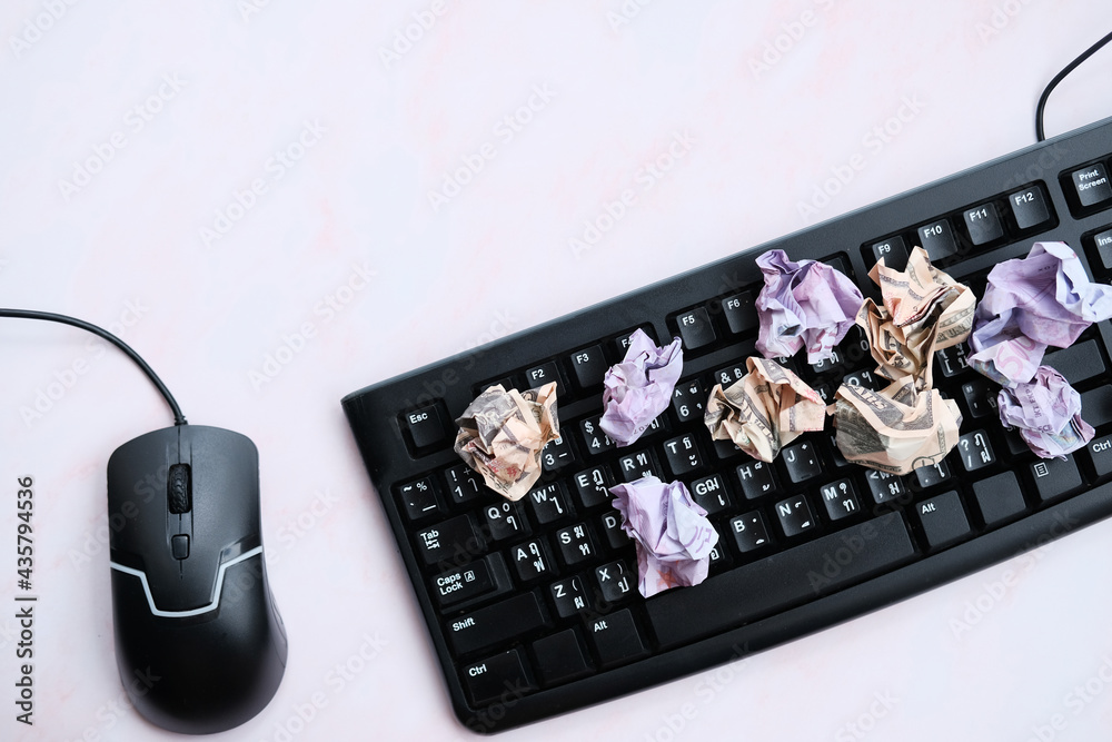 keyboard with money on white background and top view working space