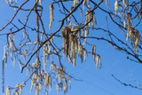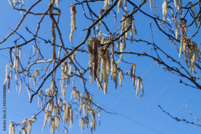 Blooming alder in spring on a sunny day with a bright blue sky