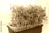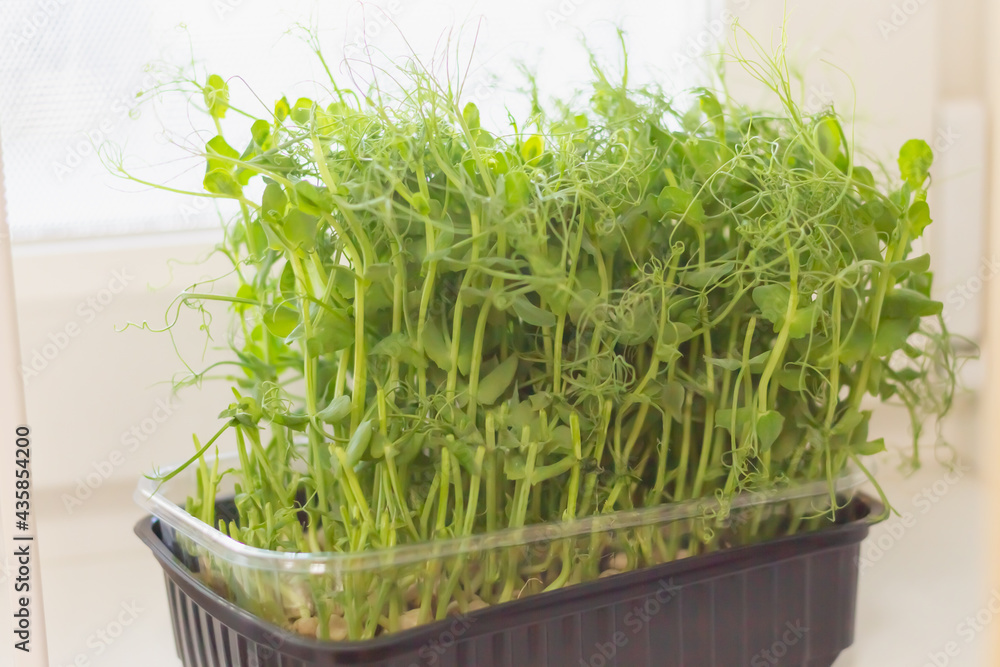 Pea seedlings are grown in a tray on the window of food, salad, food decoration