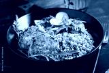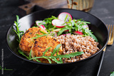 Healthy dinner. Lunch bowl with buckwheat porridge, fried chicken cutlets and fresh vegetable salad of arugula, cucumber and radish.