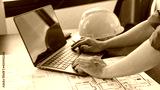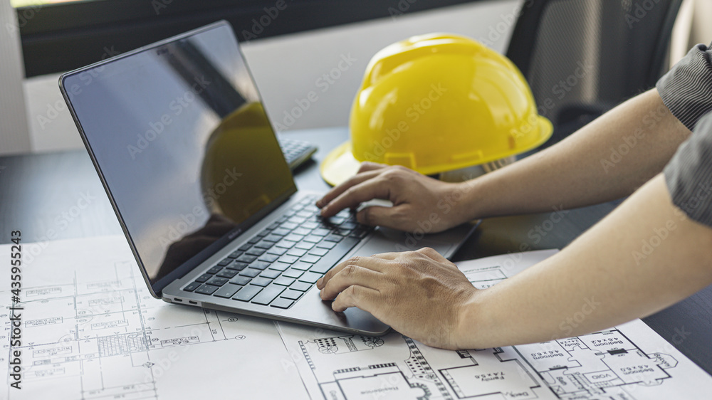 Young man with a laptop plotting a system of building structures in blueprints, Architects or engineers are designing buildings using computers to calculate the physical structure to be correct.