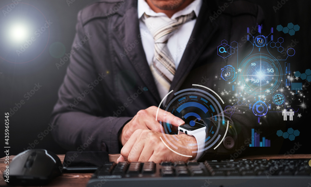 Businessman using smartwatch and business icon virtual screen and internet data and Artificial intelligence technology in the future concept