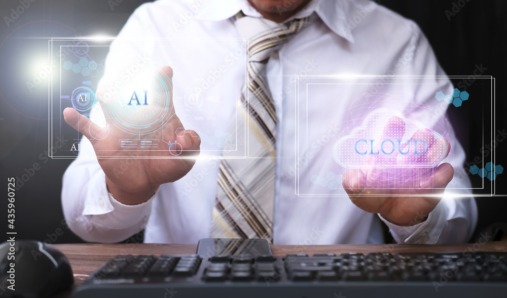Person working virtual screening network data and internet and cloud technology, artificial intelligence in the future concept
