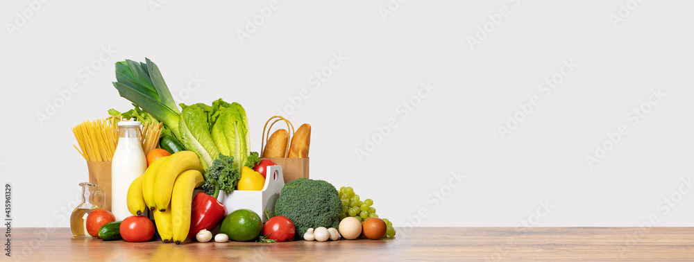 Delivery of grocery. Group of fresh fruit and vegetables bright green produce bread. Eco friendly responsible lifestyle and shopping. Healthy eating, zero waste concept. Copy space. Donation. Banner