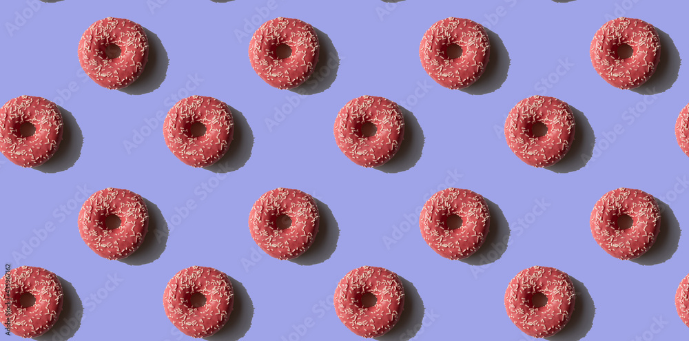 Pink Donut seamless pattern on purple background. Sunlight minimal trendy concept. Top view