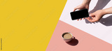 Mockup Hands holding smartphone on pink yellow background and cup of coffee with place for text. Minimal concept