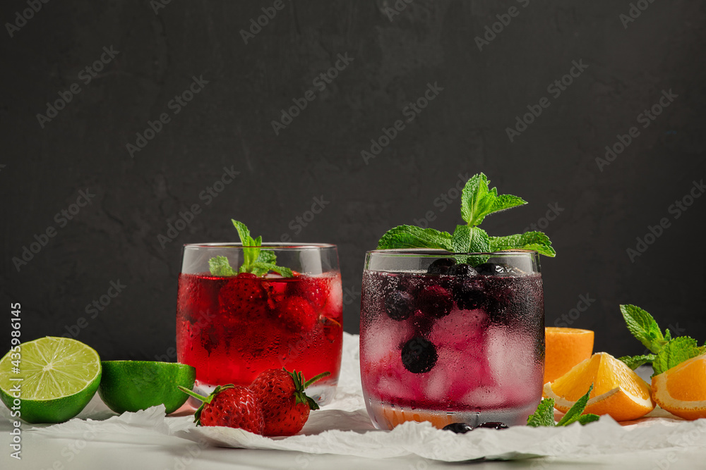 cold homemade blueberry and strawberry lemonade, in glass glasses, mint leaves, citrus slices and berries on a dark background