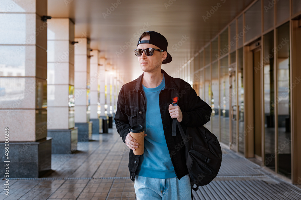 young hipster guy stands city street black cap, holding cup coffee. background modern street glass corridor