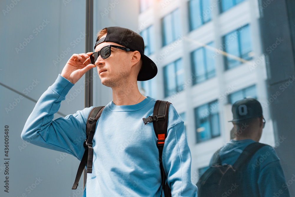 young fashionable guy in a cap sunglasses and a backpack is a student tourist. In background is modern glass building.