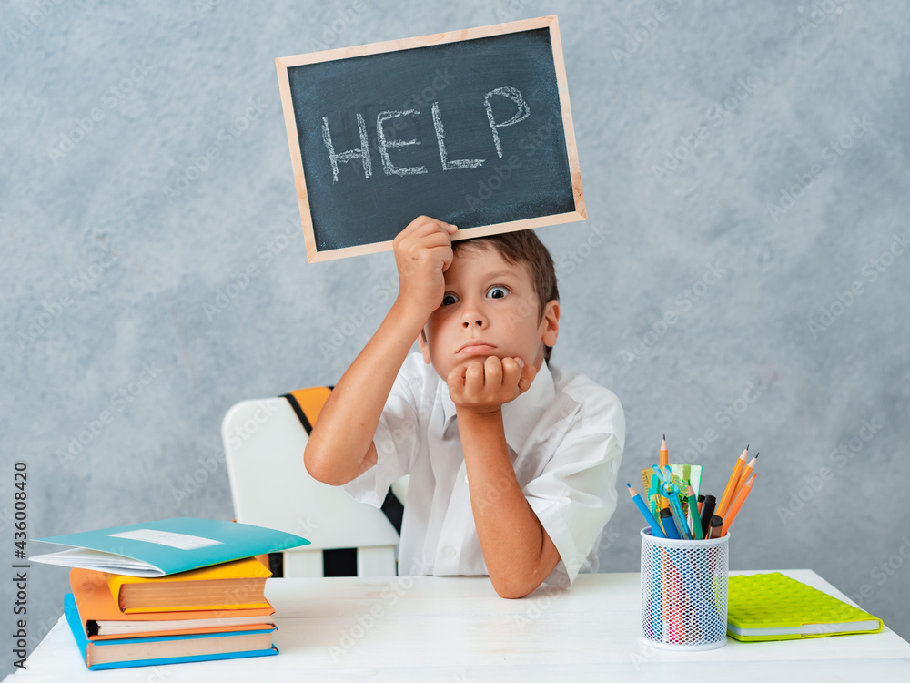 Sad tired frustrated schoolboy boy at the table and holding paper with word Help. Learning difficulties, education concept