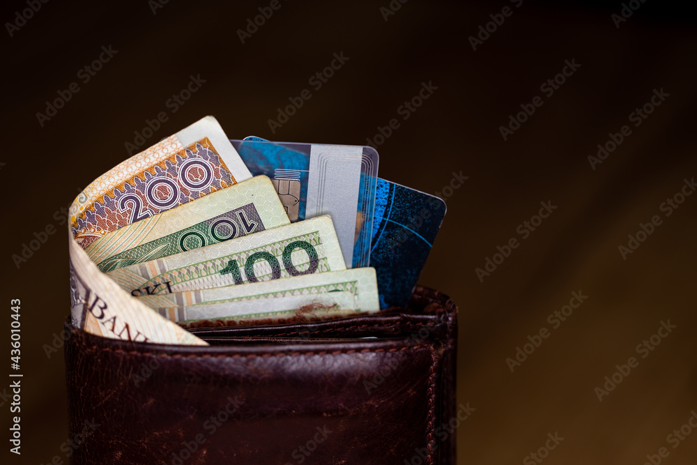 Lots of Polish banknotes and credit cards sticking out of a brown leather wallet. Photo taken under artificial, soft light