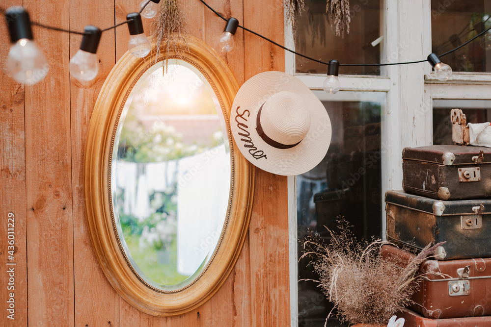 interior of the summer country cozy wooden rustic terrace with vintage accessories furniture. Atmospheric interior room for summer vacation in the country.