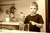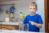 A boy of 6 years poured water from a plastic bottle into a glass at home in the kitchen