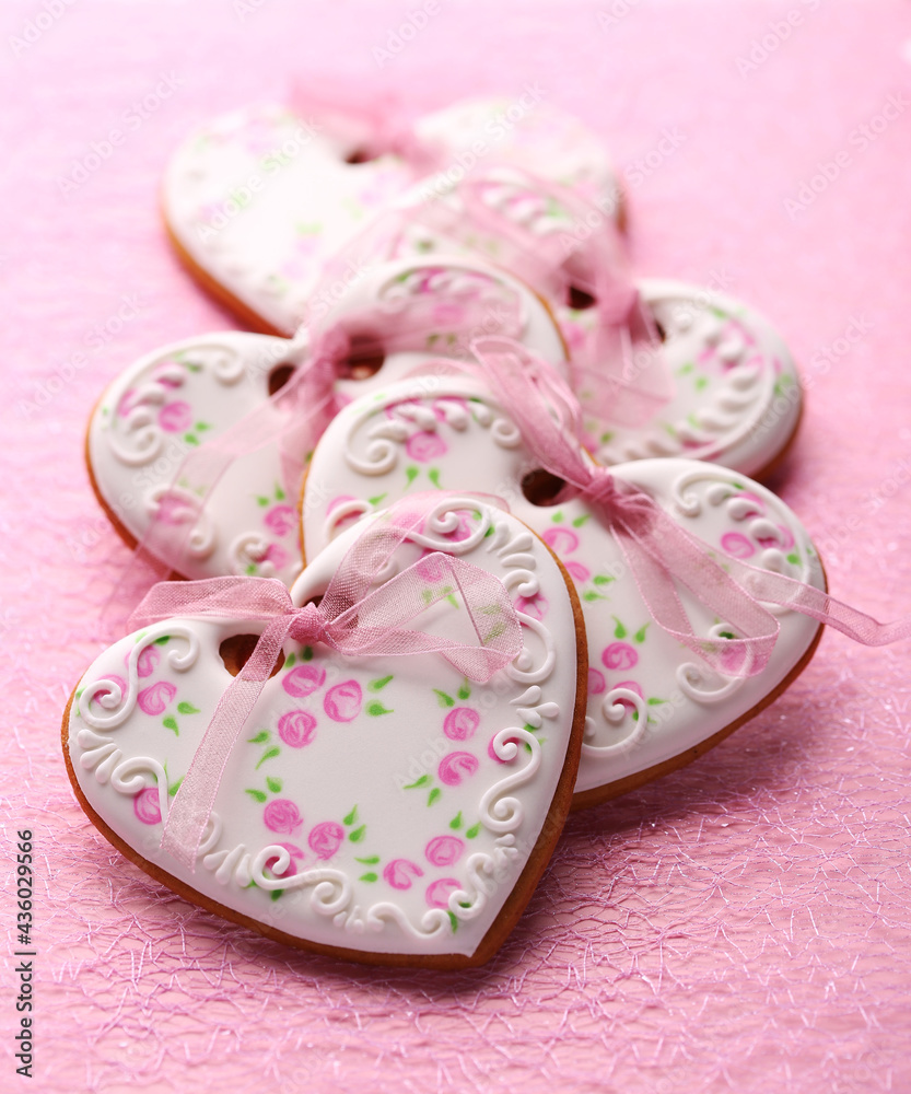 Handmade gingerbread cakes in the shape of hearts painted with a floral pattern on a pink background. A set of exclusive gingerbread cookies. A sweet gift. A gift for Valentine's Day.