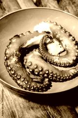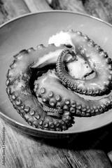 Coocked tentacles of octopus on ceramic plate