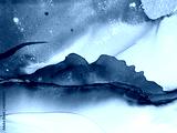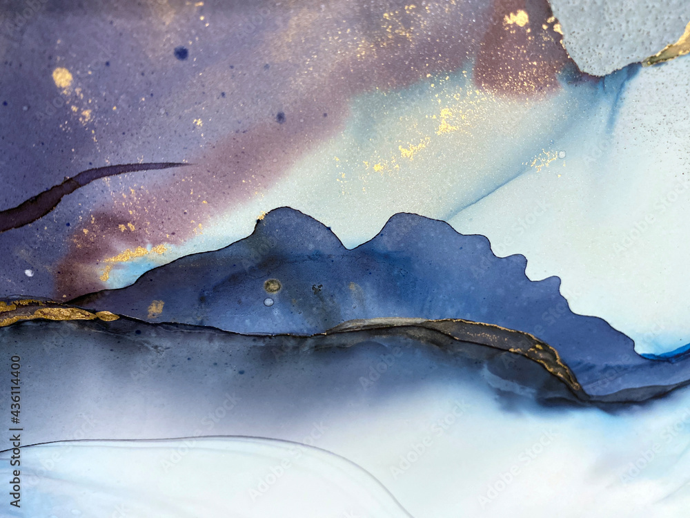 Abstract purple art with gold — violet and blue background with beautiful smudges and stains made with alcohol ink and golden pigment. Lilac fluid art texture resembles watercolor or aquarelle.