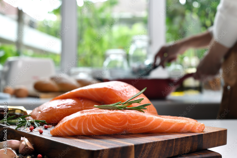 Fresh raw salmon fillet steaks with ingredient on a cutting board in the kitchen