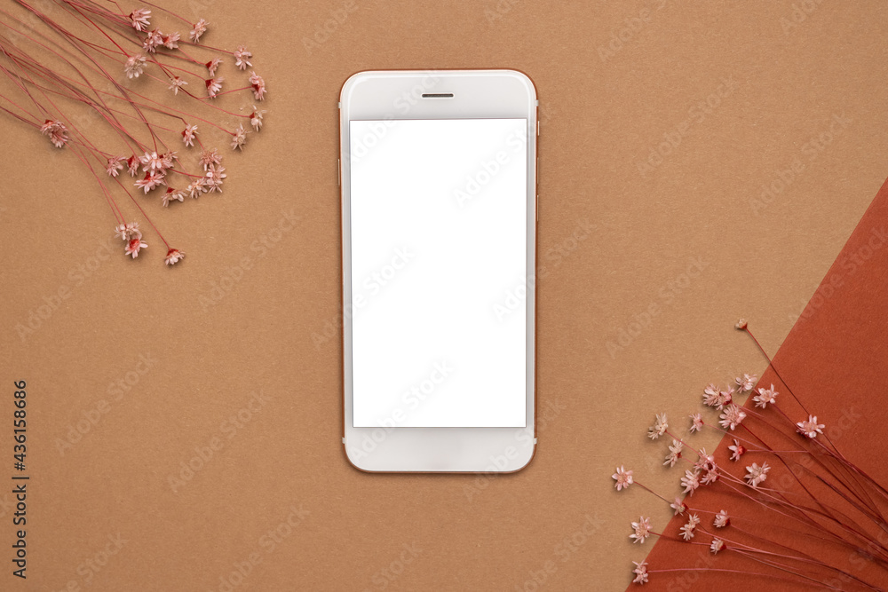 Mobile phone with white screen and dry flower branch and stone on a light brown background. Trend, minimal concept with copyspace