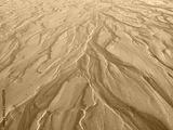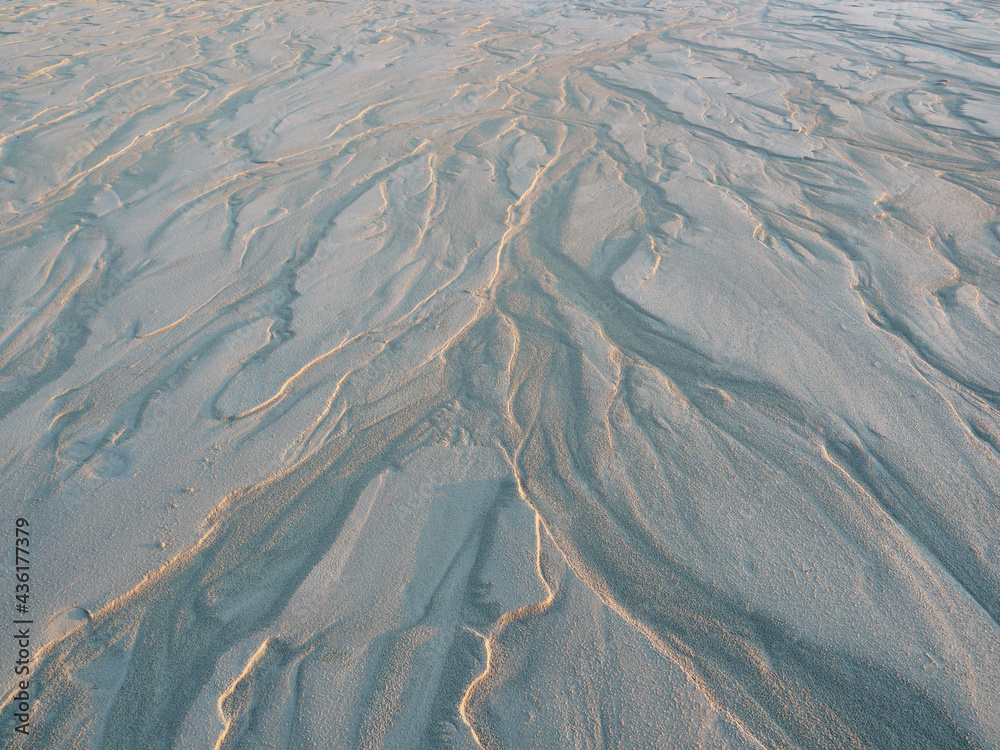 Texture of white sand in the rays of dawn, natural background. Top view of the sandy beach, close-up, copy space