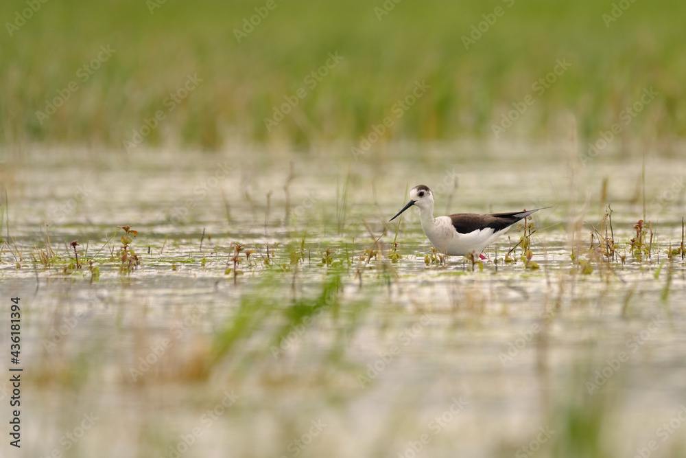 Black-winged stilt - himantopus himantopus wading in the water, red legs black and white wader
