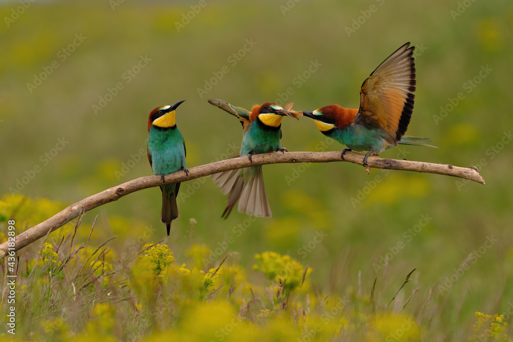 Group of colorful bee-eater on tree branch, against of yellow flowers background