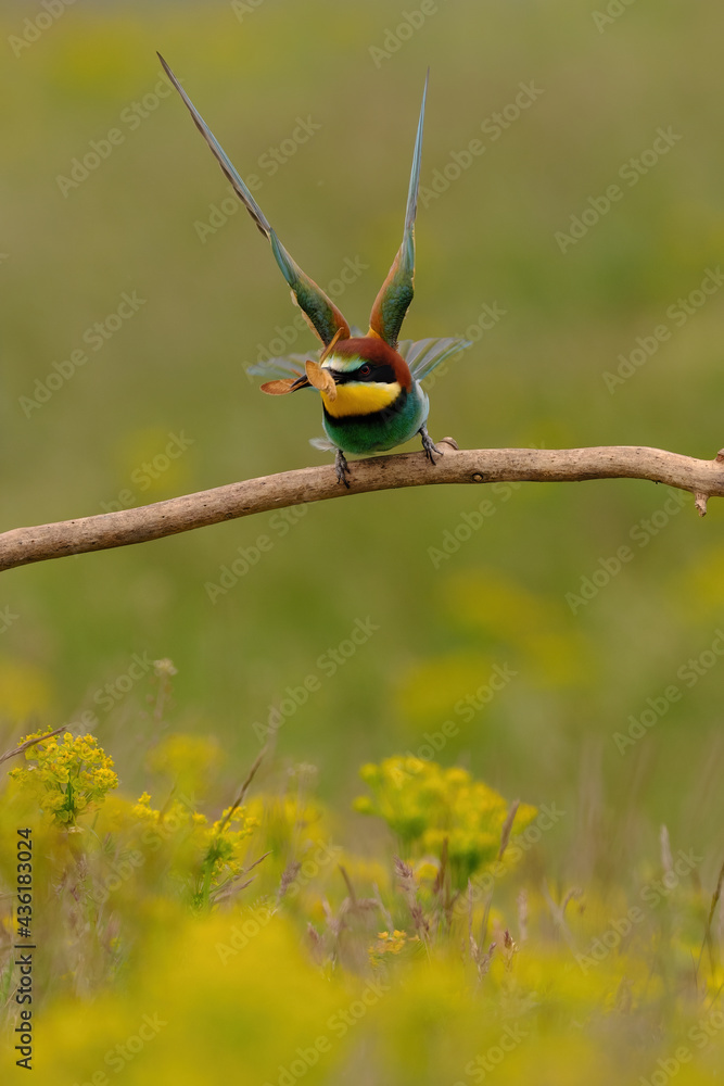 Colorful bee-eater on tree branch, against of yellow flowers background