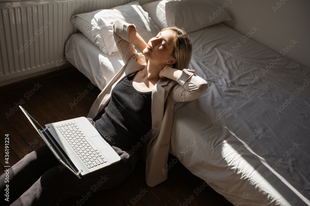 tired young female working at home with laptop