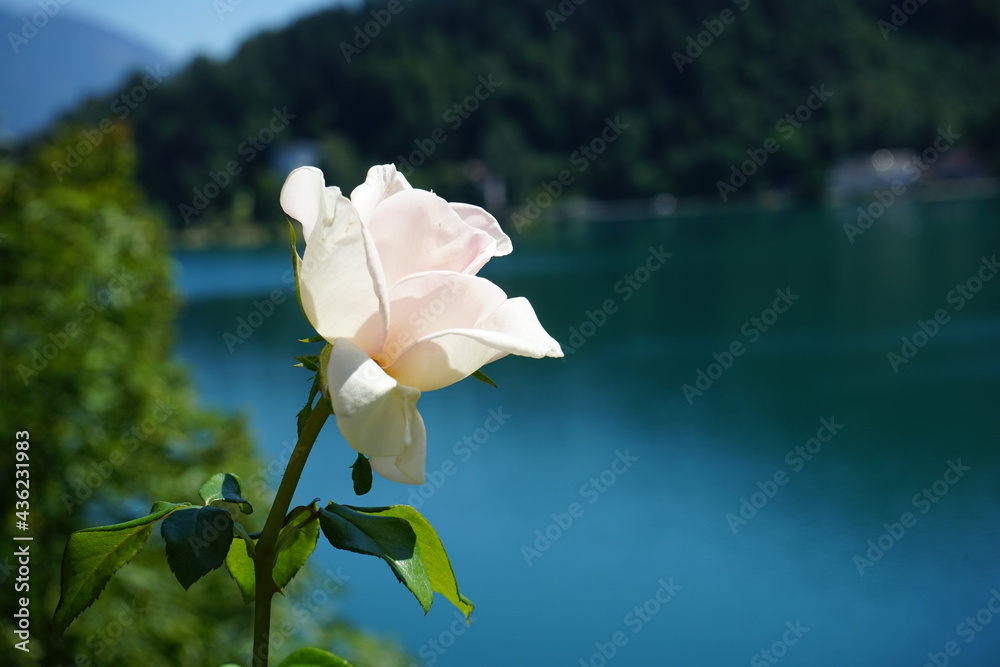 Rose on a castle, against the lake of lesce bled in Slovenia