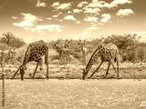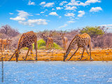 Two giraffes drinking water from waterhole. With bent long neck and outstretched legs. Dry savanna of Etosha National Park, Namibia