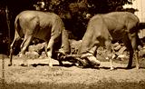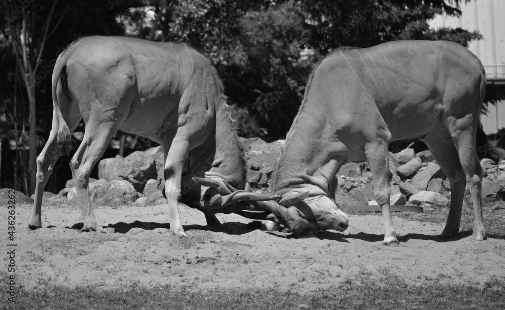 Fighting common eland or southern eland or eland antelope, is a savannah and plains antelope found in East and Southern Africa. It is a species of the family Bovidae and genus Taurotragus