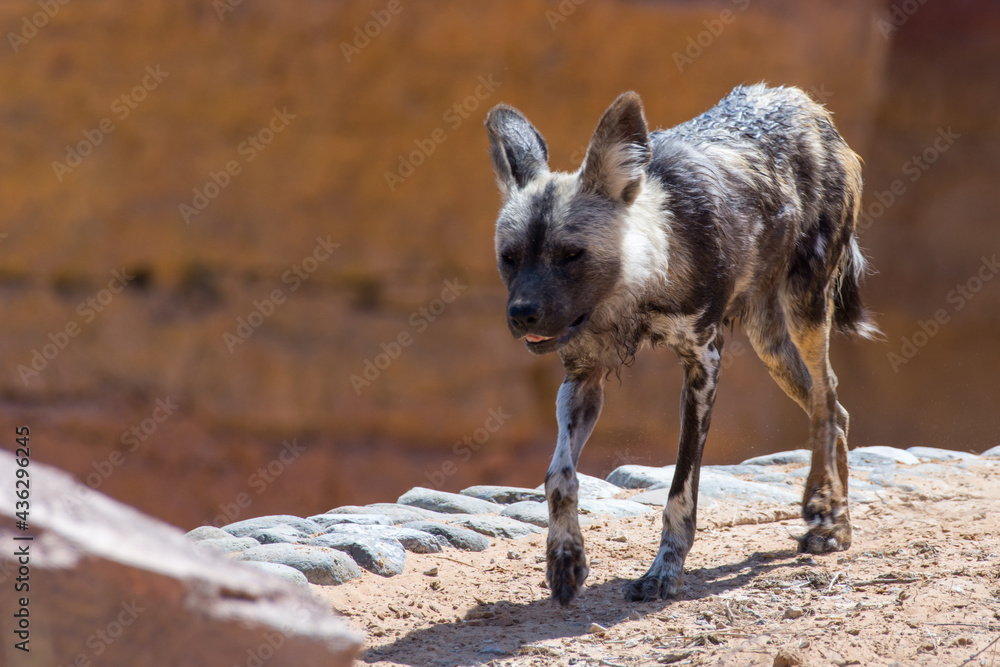 An African wild dog (Lycaon pictus) running through dry ground very close up in the rocks.