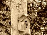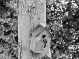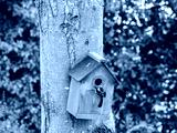 Parent blue tit entering garden nest box to provide food to their chicks and parent bird at Pickmere, Knutsford, Cheshire, Uk